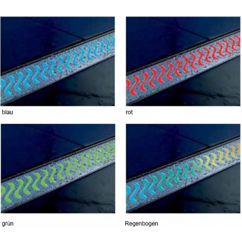 Osvětlení je možné pro liniové, obloukové a rohové sprchové žlaby ACO ShowerDrain. Je možno zvolit následující barvy: modrá, červená, zelená, duhová nebo bílá. Spuštění osvětlení je automatické: Jakmile dojde k nahromadění dostatečného množství vody v žlabu, dojde k propojení kontaktů modulu LED a diody se rozsvítí. Po prodlevě několika minut dojde k vypnutí osvětlení, jestliže již do žlabu nebude vtékat další voda. Při předpokladu denní doby sprchování zhruba 15 minut je nutno baterie nabít po přibližně třech měsících.