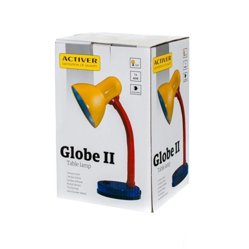 Stolní lampa Globe II. je vhodná pro doplňkové osvětlení v dětských pokojích, pracovnách a kanceláří. Lampa má ohebný krk, čímž ji lze nastavit do mnoha úhlů svícení. Lampa má vlastní vypínač úmístěný na podstavci. Lampa je určena pro žárovky se závitem E27. Podstavec je barvy modré, červený ohebný krk a žluté stínítko. Žárovka není součástí balení.Výška (cm):34