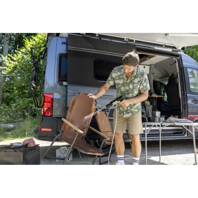 Lehká a inovativní konstrukce s výsuvnou rukojetí umožňuje úsporné skladování a snadnou přepravu. Nastavení tlaku v rozmezí 6 – 15 bar šetří citlivé povrchy a prodlužuje dobu provozu baterie až na 30 min. LED indikace informuje o stavu baterie a režimu práce. Trysky 4 v 1 Multi Jet zajišťují rychlé přepínání mezi typy stříkání, a tryska pro čisticí prostředek umožňuje efektivní aplikaci přípravků.
