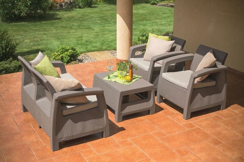 Elegantní souprava CORFU je pohodlné a moderní posezení jak ven, tak do interiéru. Souprava je vyrobena z lisovaného plastu v provedení imitace ratanu. Skládá se ze dvou křesel s poduškami, dvojmístné pohovky s poduškami a stolu. Souprava patří k nejprodávanějším v této kategorii! Tento produkt se vyznačuje vysokou životností a odolností vůči povětrnostním vlivům a UV záření. Čištění měkkým hadříkem vlažnou vodou se saponátem.