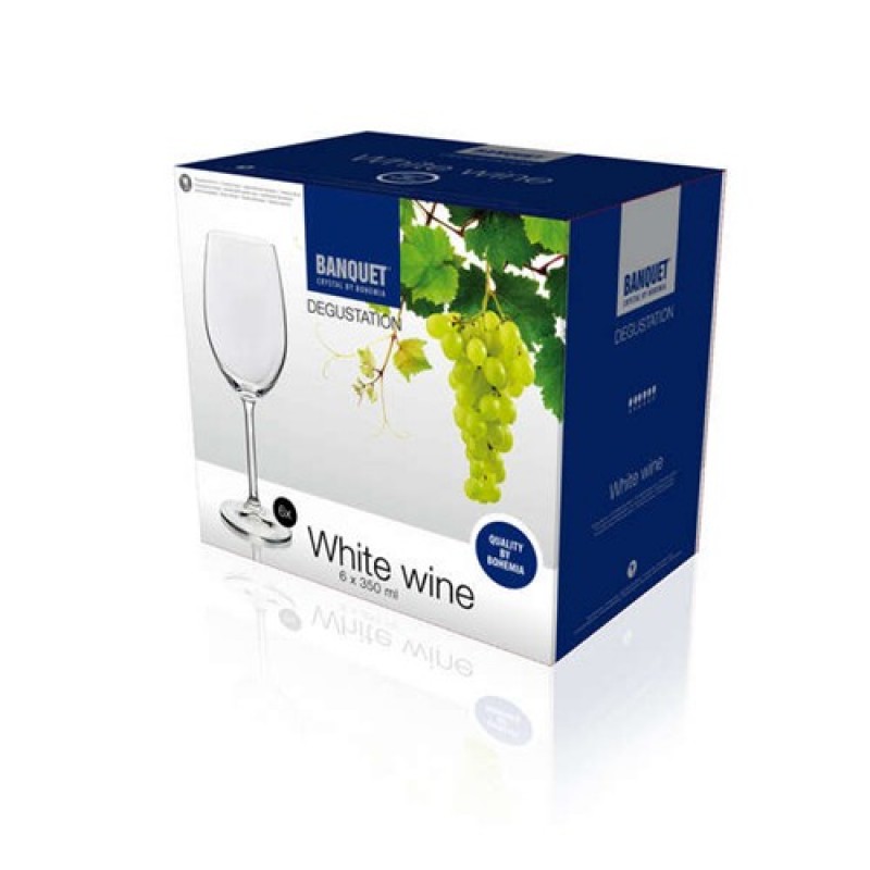 BANQUET Degustation Crystal sklenice na bílé víno, 350ml, 6ks, 02B4G0013506 dílná sada sklenic Crystal Banquet bílé víno 350, 6 ks v ozdobném obalu. Velmi kvalitní sklo české výroby, tvrzený okraj, vhodné do gastro provozu. Vhodné jako dárek.