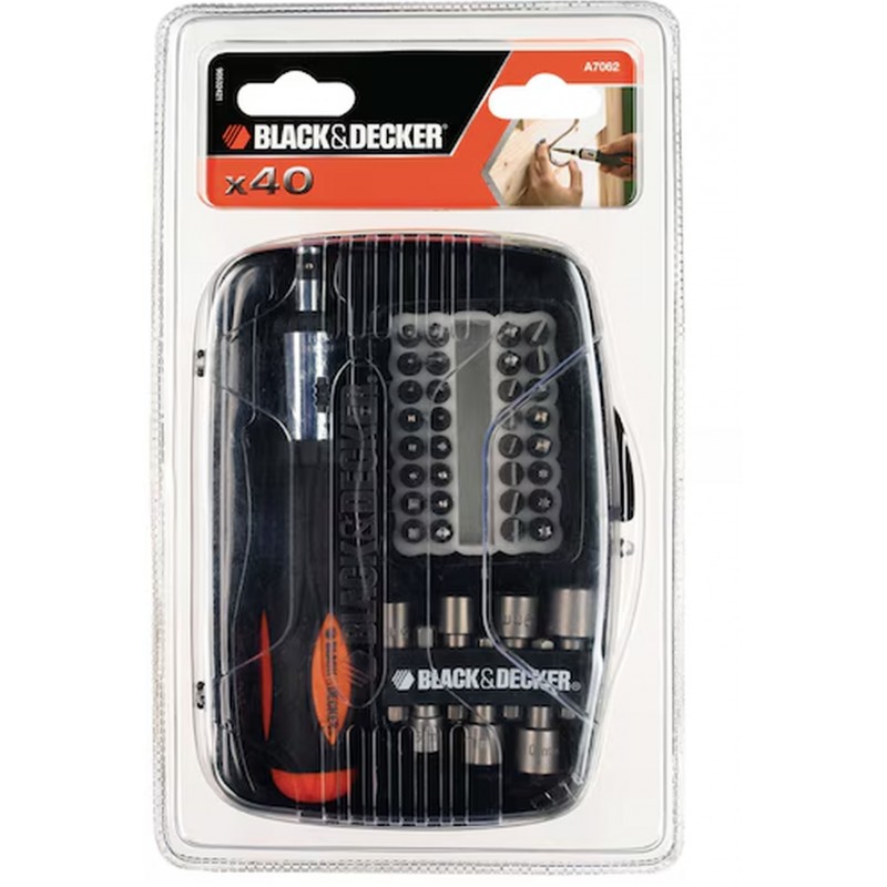 Black & Decker A7062-XJ je kompletní sada 40 nejpoužívanějších bitů a nástavců s praktickým ráčnovým šroubovákem, ideální pro domácí kutily a hobby projekty. Díky kvalitnímu zpracování a atraktivnímu balení značky Black & Decker je tato sada spolehlivým doplňkem každé dílny.
