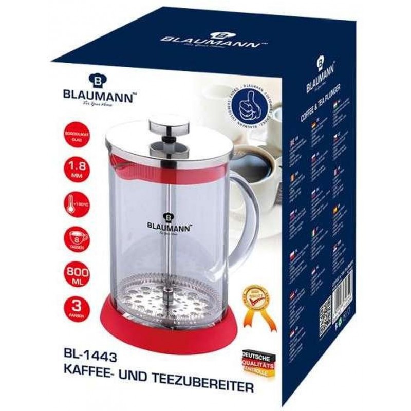 BLAUMANN French Press Konvička na čaj a kávu 350 ml, červená BL-1441- materiál: borosilikátové sklo 1,8 mm odolné do 180°C / nerez / silikon/ plast