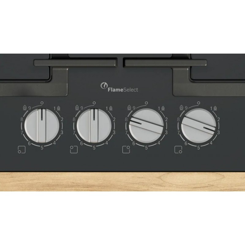 Plynová varná deska s precizní regulací plamene a snadným čištěním díky odnímatelným kovovým knoflíkům a litinovým roštům, které lze mýt v myčce nádobí.