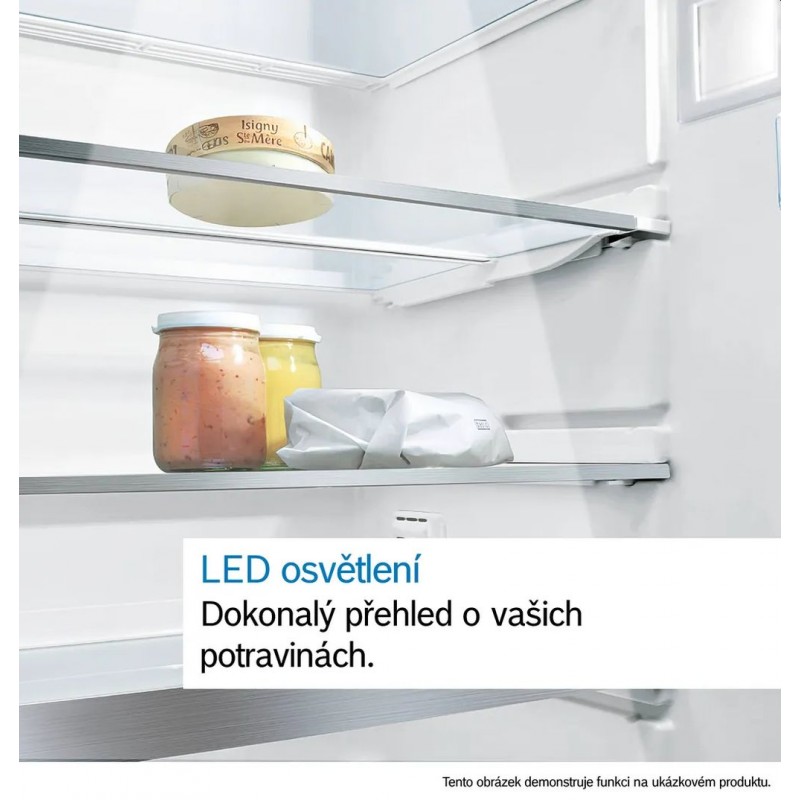 Prostorná vestavná chladnička s mrazničkou s funkcí VitaFresh XXL <0°>, No Frost a konstantní teplotou udrží vaše potraviny déle čerstvé. Veškeré zmrazené potraviny zůstanou bez námrazy a v dokonalém přehledu díky druhému osvětlení mrazicího prostoru.