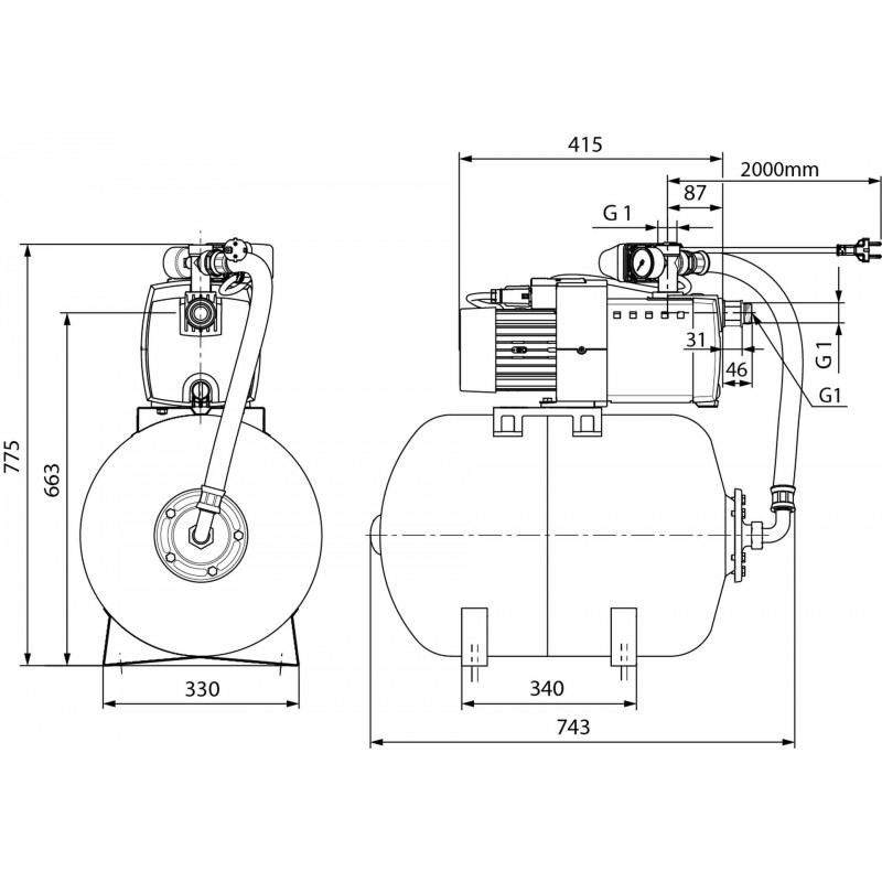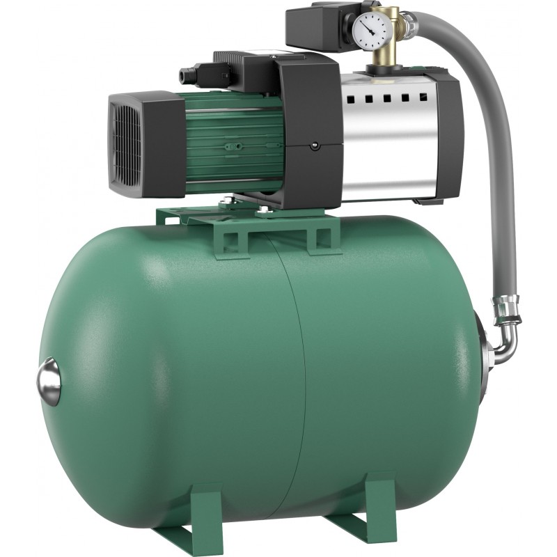 Systém je doplněn o membránovou tlakovou nádobu s robustní vyměnitelnou membránou EPDM, která zajišťuje stabilní tlak a dlouhou životnost. Součástí je také tlakový spínač, manometr, flexibilní tlaková hadice a elektrická rychlospojka. Motor má ochranu proti přetížení s automatickým resetem.