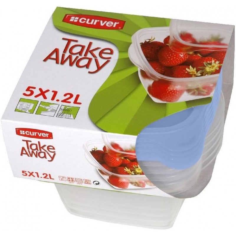 CURVER Sada dóz TAKE AWAY 5x 1,2 l, 16.5 x 16 x 14 cm, transparentní modrá, 08323-001Sada pěti dóz od značky Curver pro uskladnění potravin. Dózy lze použít v mikrovlnné troubě, mrazničce i chladničce a myčce nádobí. Tyto dózy uchovají potraviny déle čerstvé.