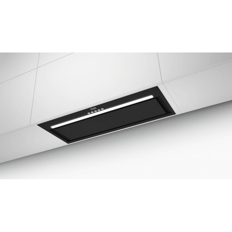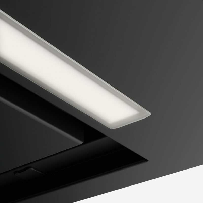 Vestavný odsavač par Box Flush Evo. Provedení Matná černá (NCS S 9000-N). Energetická třída B. Tlačítkové ovládání. Štěrbinové odsávání. 3 Stupně výkonu. Intenzivní stupeň.