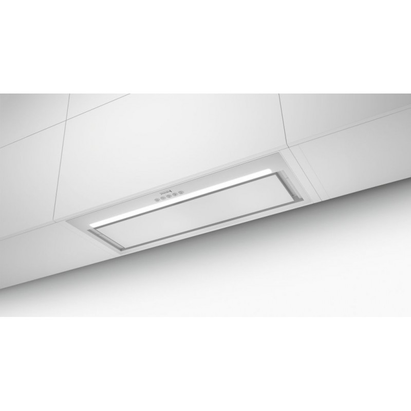 Vestavný odsavač par Box Flush Evo. Provedení matná bílá (NCS S 0500-N). Energetická třída B. Tlačítkové ovládání. Štěrbinové odsávání. 3 Stupně výkonu. Intenzivní stupeň.