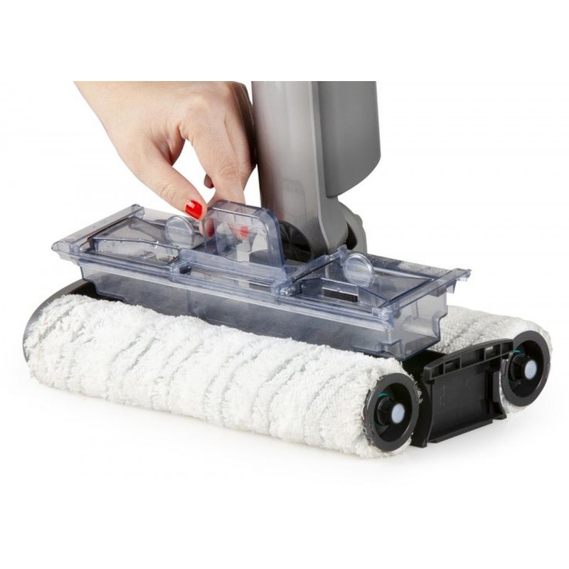 Elektrický aku čistič podlah umožňuje v jenom kroku sebrat z podlahy nečistoty, vyčistit podlahu a vysušit přebytečnou vodu. Ušetříte tak nejen podstatnou část svého času věnovaného úklidu podlahy, ale podlaha také velmi rychle usychá a pro její vytření spotřebujete až o 90% méně vody než s běžným mopem. Další nespornou výhodou podlahového čističe jsou oddělené zásobníky na čistou a špinavou vodu integrované na těle přístroje. Díky nim již není potřeba s sebou poponášet kbelík a ždímat špinavý mop, ani jej namáčet do čisté vody. Po skončení úklidu jednoduše mop můžete rozebrat a omýt jednotlivé části, nebo využít automatické funkce samočištění a válce vyprat v k tomu určené čistící základně.