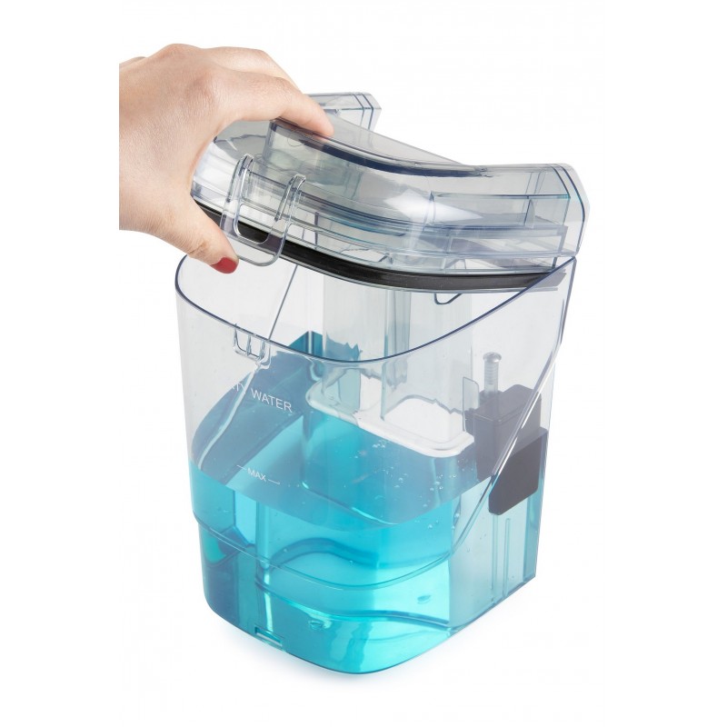 Funkce elektronického rozprašování zvlhčuje jen potřebná místa, zatímco špinavá voda se shromažďuje v samostatné nádrži o objemu 1,1 litru. Díky 1,3 litrové nádrži na čistou vodu, automatickému vypnutí při naplnění nádrže a praktickému úložnému prostoru pro hadici a kabel je používání přístroje jednoduché a velmi pohodlné.