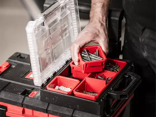 Organizér obsahuje 4 třídicí boxy: tři malé a jeden velký box s přepážkami umožňují přehledné uložení šroubů, hmoždinek apod.