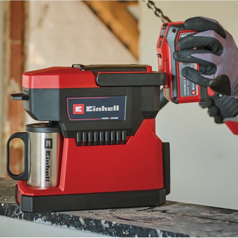 Aku kávovar Einhell je ideální na cestách: lehký, praktický a bez kabelů. Sada obsahuje veškeré příslušenství, které potřebujete k vychutnání kávy. Včetně prachotěsného, 90 mm vysokého šálku z nerezové oceli, který pojme až 240 ml, odpovídajícího víčka, odměrky, nádoby na mletou kávu s kávovým filtrem a nádoby na běžně dostupné kávové kapsle.