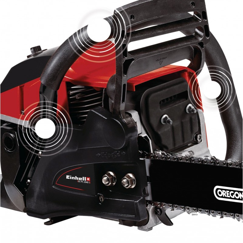 Benzínová řetězová pila Einhell GC-PC 2040 I kombinuje výkon s ostrostí a bezpečnost se snadnou manipulací. Kombinace kvalitní benzínové řetězové pily Einhell a kvalitní lišty a řetězu OREGON zajišťuje, že zahrádkáři stojí po boku silný a spolehlivý partner. Ať už na zahradě, na dvoře nebo v dílně: benzínová řetězová pila je univerzál pro jednoduchou a hrubší práci se dřevem. Vzduchem chlazený dvoutaktní motor s klikovou hřídelí s ložisky po obou stranách je silným pohonem a poradí si dokonce i s nepoddajným dřevem: Větve a hranoly, obrobky a palivové dříví proti benzínové řetězové pile nic nezmůžou. Díky celé řadě technických podpůrných funkcí je manipulace s benzínovou řetězovou pilou od Einhell snadná a bezpečná. Antivibrace tlumí nárazy při provozu – tímto způsobem jsou šetřeny síly uživatele. Snadné nastartování umožňují pomůcky pro studený start „primer“ a automatický sytič. Díky digitálnímu zapalování je zaručen rychlý a dynamický příjem směsi paliva a vzduchu a stabilní chod motoru. Optimální bezpečnost uživatele zajišťuje ochrana proti zpětnému rázu s okamžitou brzdou řetězu. Ta se aktivuje bezprostředně při vymrštění pily, řetěz se tak okamžitě zastaví. Benzinová řetězová pila je navíc vybavena zachytávačem řetězu, což minimalizuje riziko i při vyskočení řetězu. Velký a robustní ozubený kovový doraz zajišťuje bezpečné a pohodlné vedení při všech pracích. Automatické mazání řetězu dodává řetězu dostatečné množství oleje. Optimální uložení zajišťuje přiložený kryt lišty. Dodávka zahrnuje nádobu na míchání benzínu a oleje.