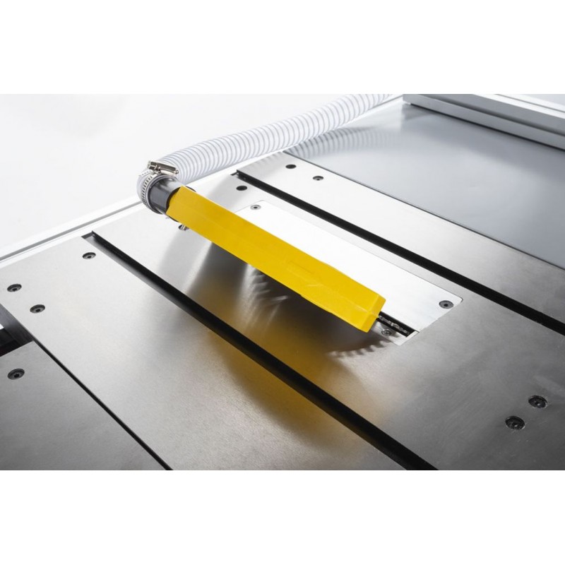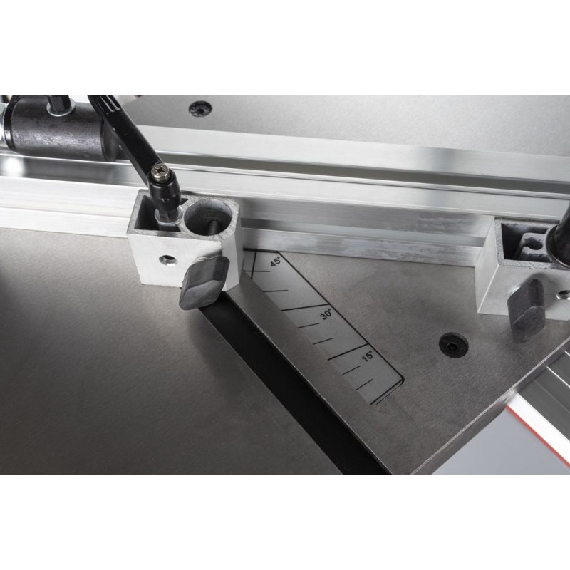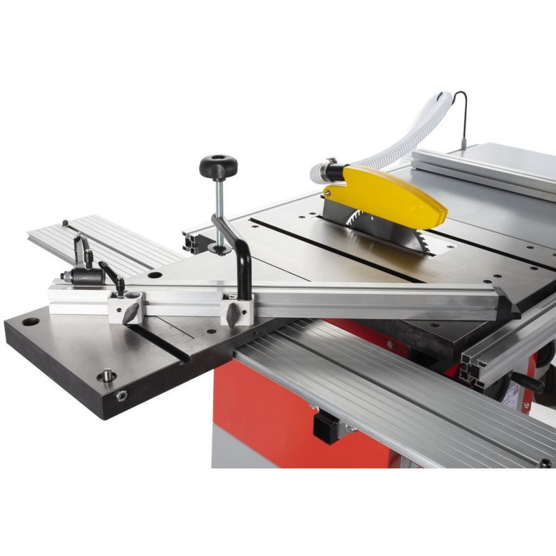 Pila je vybavena stabilním stolem z šedé litiny včetně prodloužení, což zajišťuje maximální přesnost a komfort při práci i s většími obrobky. Manuální nastavení výšky a úhlu kotouče (90°–45°) umožňuje flexibilní použití pro podélné i šikmé řezy. Samozřejmostí je podélné i příčné pravítko pro přesné vedení materiálu.