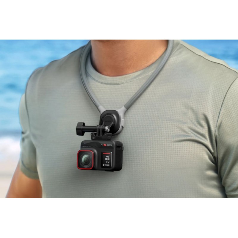 Pohodlný držák na krk pro kamery Insta360 GO 3S, GO 3, GO 2, X4, X3, ONE X2, Ace Pro 2 a ONE RS (4K i Twin edice) umožňuje natáčení z pohledu první osoby bez použití rukou. Má 360° otočnou základnu, rychlý uzamykací mechanismus a měkký, prodyšný silikon pro celodenní pohodlí.