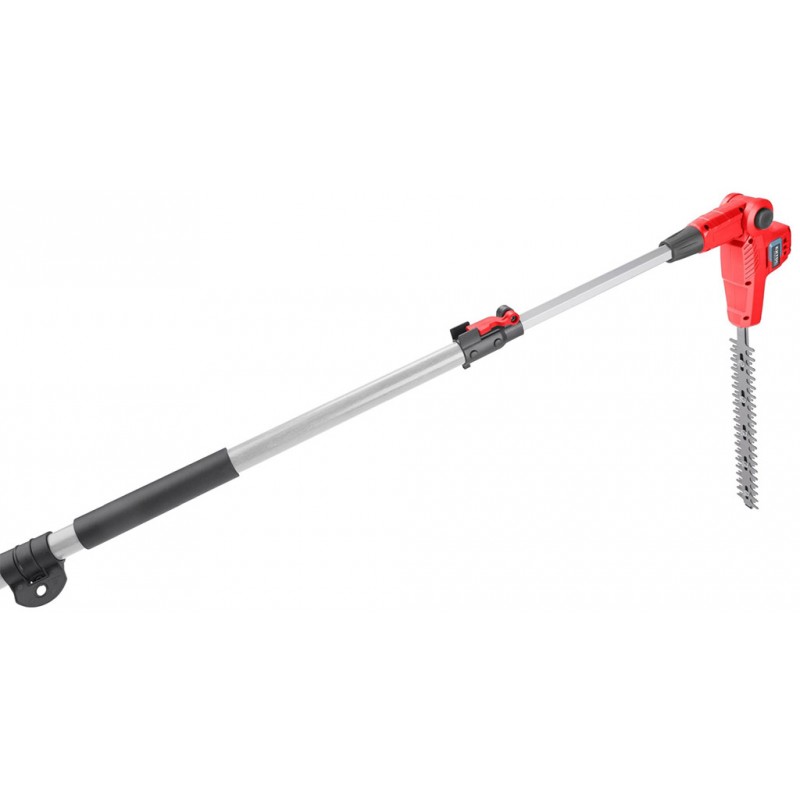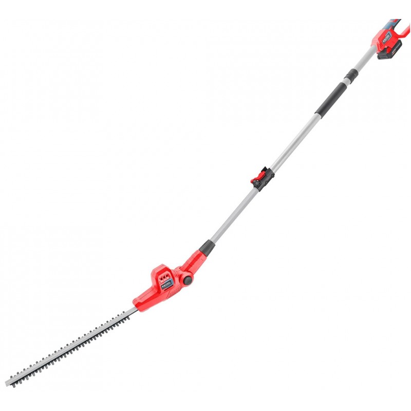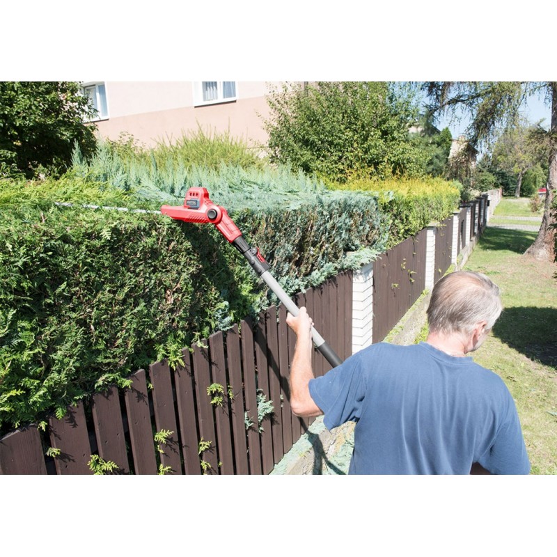 Teleskopické aku nůžky jsou určeny ke stříhání živého plotu ve výškách až 3m v domácích zahradách. Dobré vyvážení, nízká hmotnost a ramenní popruh usnadňují manipulaci při práci. Horní část nůžek je vybavena kloubem, který umožňuje upravit sklon čepele dle typu práce. Maximální průměr střihaných větví je 15mm. Pogumovaná rukojeť brání vysmeknutí, tlumí vibrace a zpříjemňuje držení při práci. Ostrá stříhací čepel si snadno poradí s živým plotem a je osazena hliníkovou lištou, která ji chrání před poškozením. Stroj je vybaven bezpečnostní pojistkou, která se aktivuje při vyklouznutí z rukou a elektronickou doběhovou brzdou, která zajistí jeho rychlé zastavení. Díky napájení z baterie již není nutné dávat pozor na napájecí kabel a manipulace s nimi je pohodlnější. Akumulátor je vybaven ukazatelem nabití, což umožňuje uživateli si rozvrhnout délku práce a dát si včas nabít další akumulátor. Díky použité Li-ion technologii je ho možné kdykoliv dobíjet, aniž by se tím snižovala jeho kapacita. Li-ion akumulátor ztrácí energii vlivem samovybíjení velmi pomalu a vydrží dlouho nabitý a připravený k použití.