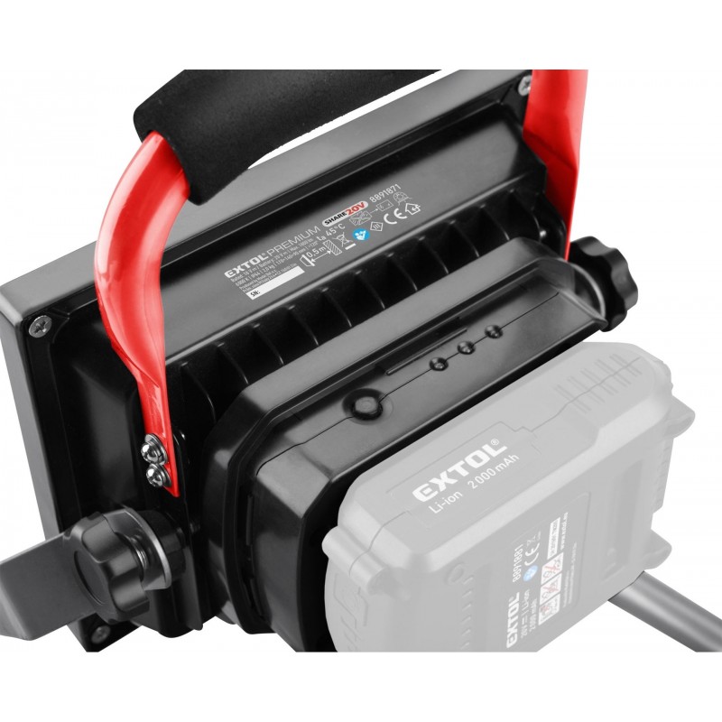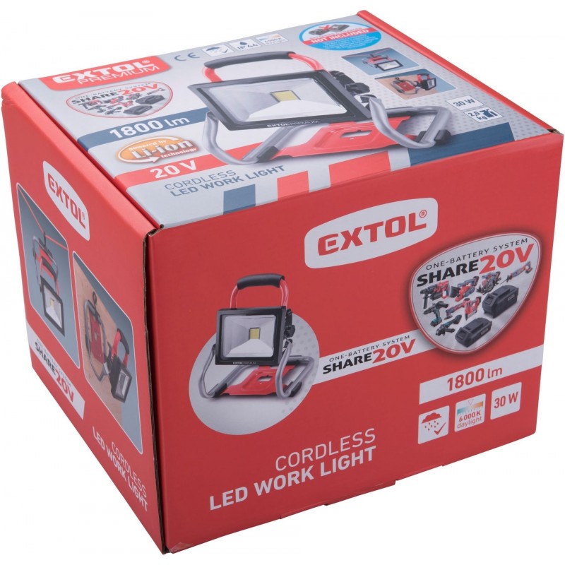 LED reflektor je zdrojem příjemného bílého světla, které kvalitou odpovídá dennímu světlu. LED reflektor se stojanem je díky vysokému výkonu a jednoduchému a dobře polohovatelného stojanu ideálním pracovním světlem. Reflektor je také připraven na rozmanité uchycení světla - lze ho pověsit na lano nebo hřebík, ale také přišroubovat na stěnu nebo sloup. Baterie je zakryta průhledným krytem a s jeho pomocí dosahuje reflektor krytí IP44. Díky napájení akumulátory SHARE20V lze zajistit nepřetržitý provoz světla, prostě jen vložíte nabitý akumulátor a pokračujete dále. Akumulátor lze použít ve všech typech nářadí řady EXTOL SHARE20V. Díky použité Li-ion technologii je ho možné kdykoliv dobíjet, aniž by se tím snižovala jeho kapacita. Li-ion akumulátor ztrácí energii vlivem samovybíjení velmi pomalu a vydrží dlouho nabitý.HLAVNÍ PŘEDNOSTI