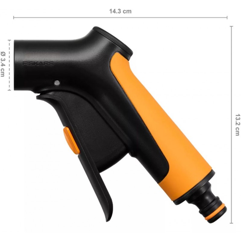 FISKARS ergonomická rukojeť s předním ovládáním umožňuje plynule nastavit průtok a díky zámku jej bezpečně zajistit. Rukojeť je odolná vůči poškození způsobenému mrazem a při nízkých teplotách je příjemnější a teplejší na držení než kovové trysky.