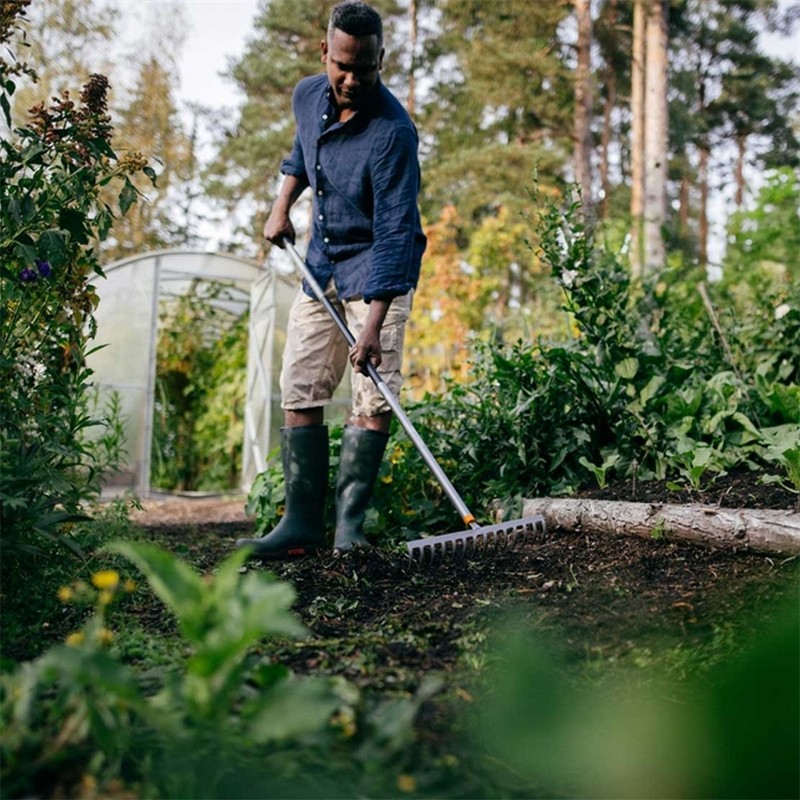 - Odolná hlava s 14 hroty – ideální pro práci na větších plochách, efektivně zvládá hrabání a vyrovnávání půdy.