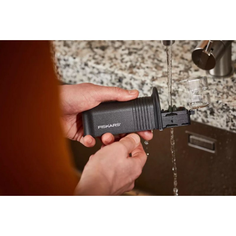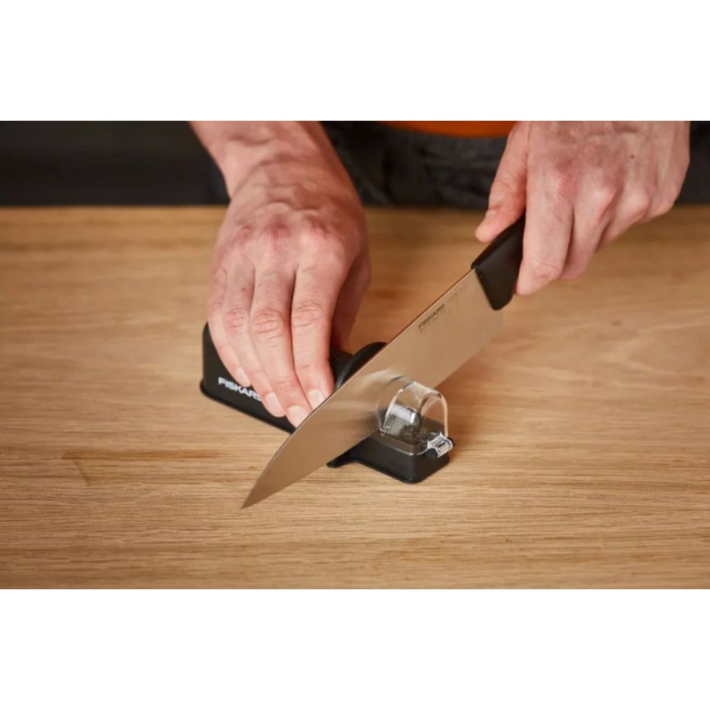 Ostřič nožů FISKARS Roll-Sharp™ je praktický nástroj pro udržení optimální ostrosti vašich nožů. Díky keramickým ostřícím kotoučkům je vhodný pro leváky i praváky a zajišťuje snadné, rychlé a bezpečné broušení přímo na kuchyňském stole, aniž by ostřič klouzal.