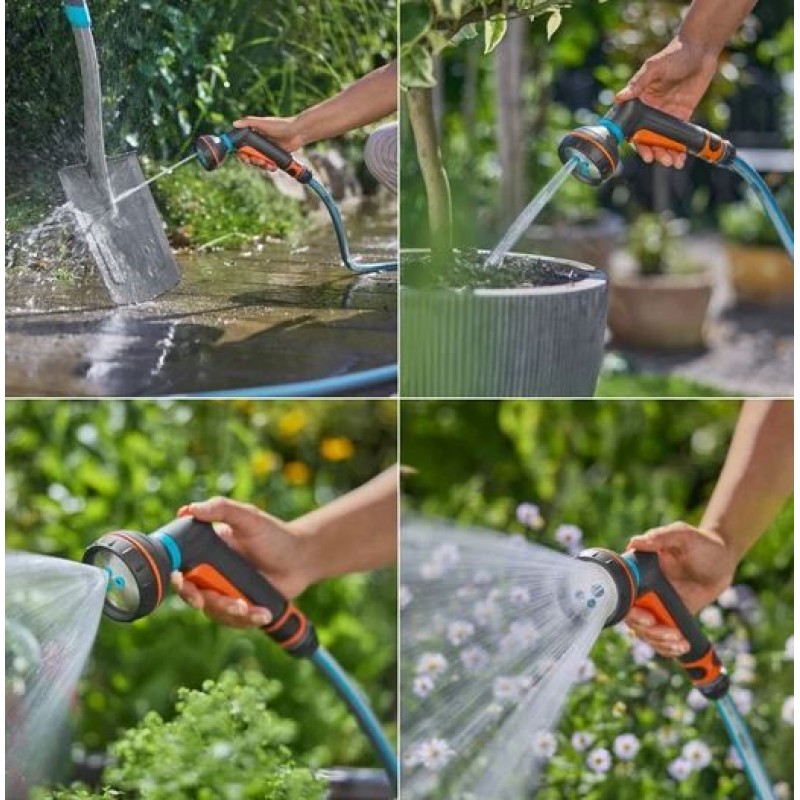 Sprcha umožňuje volbu mezi kuželovým proudem pro citlivé rostliny, silným proudem pro čištění, objemovým proudem vhodným pro květináče a jemným postřikem pro rovnoměrné zavlažování záhonů. Přepínání mezi jednotlivými režimy je snadné a rychlé.