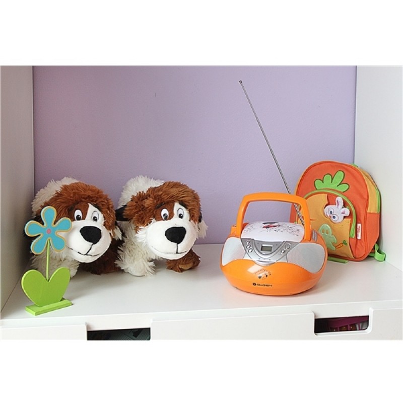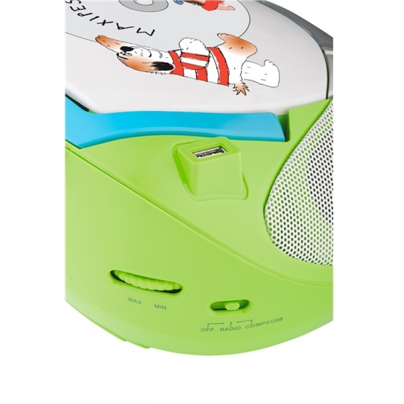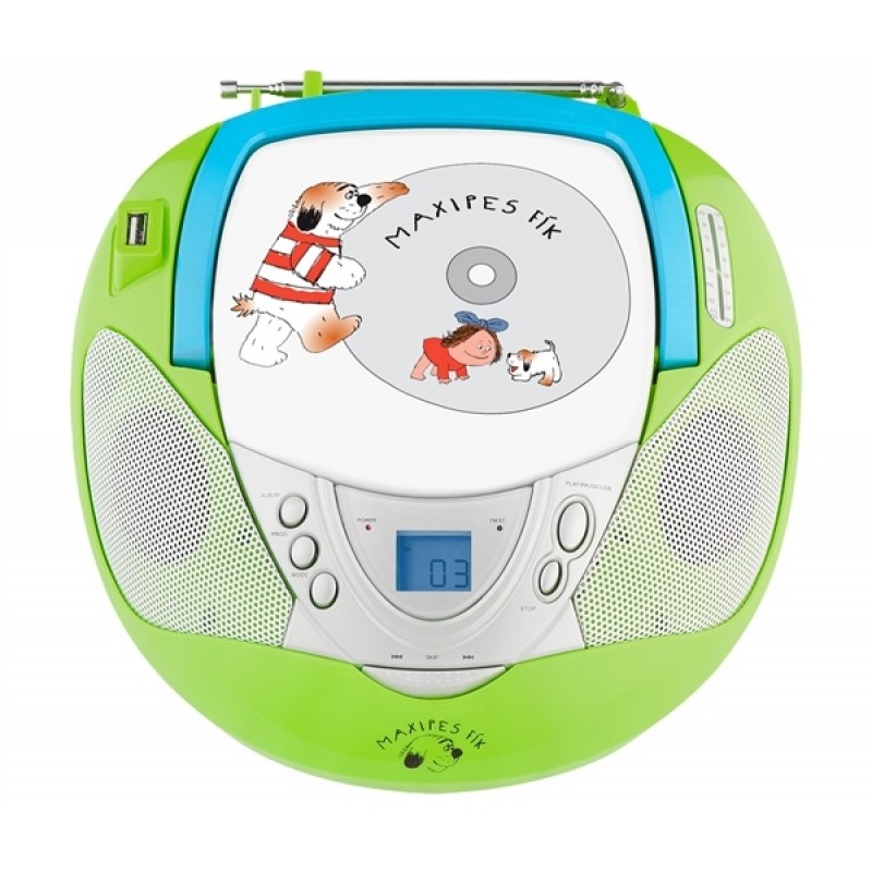Do veselého designu s obrázky Maxipsa Fíka jsme zabalili CD přehrávač, který zvládá samozřejmě formáty CD-R/RW, dále analogový FM/AM tuner pro poslech rádia a to vše doplnili USB vstupem pro připojení Flash pamětí nebo externích pevných disků na přehrávání skladeb ve formátu mp3.