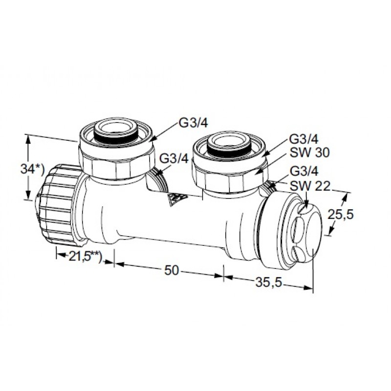 HEIMEIER radiátorový ventil Multilux 3/4", rohový, vnější, dvoutrubková s. 3851-02.000Vnější závit.