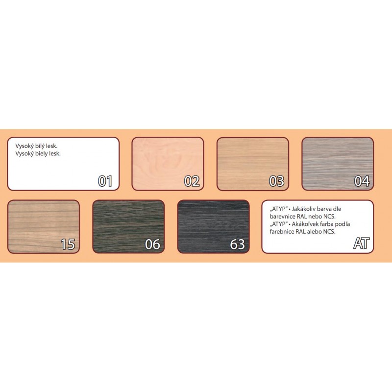 povrch čelních ploch: - bílá leská 01, nebo v dřevodekoru 02, 03, 04, 06, 15, 63