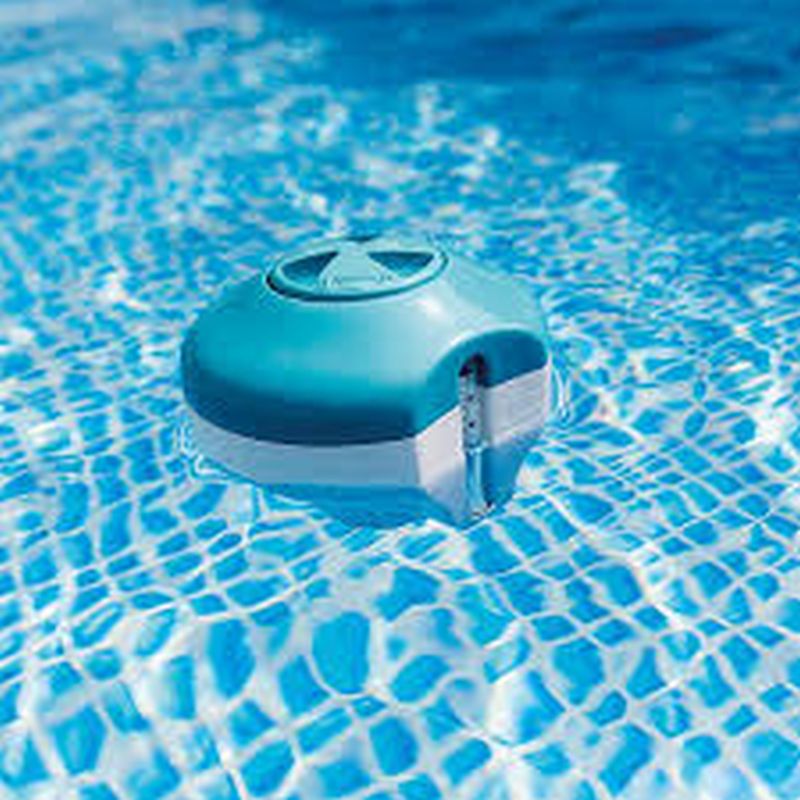 Údržba bazénu nikdy nebyla jednodušší. Dvouplášťový dávkovač chloru Intex s teploměrem pro chlórové nebo bromové tablety o velikosti 2,54 cm.
