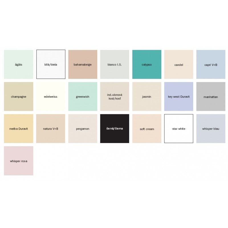 Také možno zakoupit v barvách: ägäie, bílá, bahamabeige, bianco I.S., calypso, candel, capri V+B, champagne, edelweiss, greenwich, ind. slonová kost, jasmín, key west Duravit, manhattan, melba Duravit, natura V+B, pergamon, černá, soft-cream, star white, whisper blau, whisper rosa.