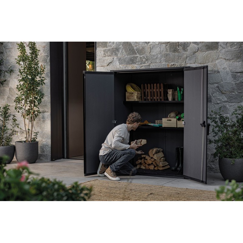 - Prostornost a organizace: Objem 1.400 L poskytuje dostatek místa pro uložení různých zahradních potřeb, jako je nářadí, květináče a další doplňky. Součástí skříně jsou dvě police, každá s nosností 25 kg. Díky policím můžete prostor ještě lépe uspořádat dle potřeby.