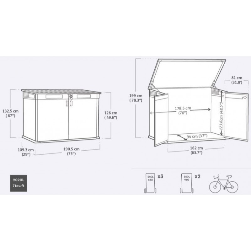 Skříň SIGNATURE od značky Keter nabízí elegantní a praktické řešení pro uložení popelnic, ale i dalšího zahradního náčiní. Díky objemu 2.020 l v ní lze uschovat až dvě popelnice o objemu 360 l nebo tři popelnice o objemu 240 l.