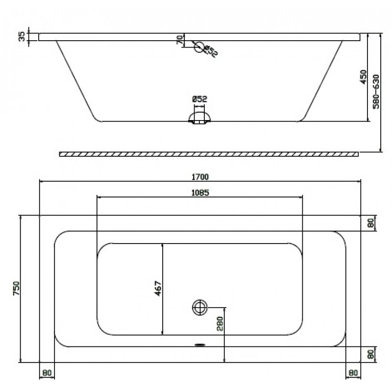 KOLO Modo pravoúhlá vana 170 x 75 cm, odtok uprostřed XWP1171000