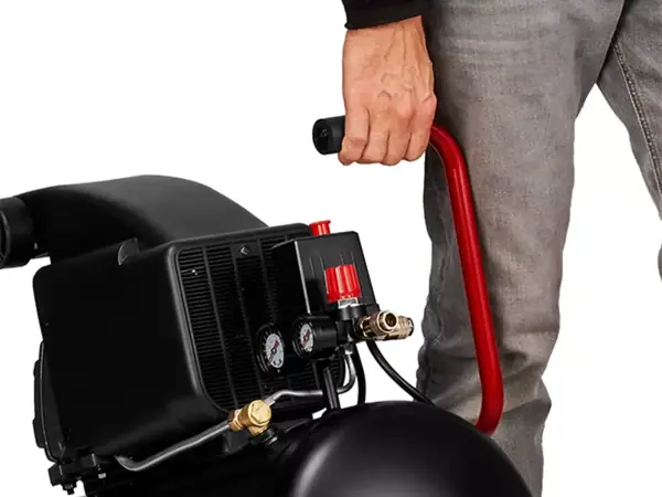 Díky praktickému transportnímu madlu a dvěma pevným kolům je kompresor snadno přenosný.