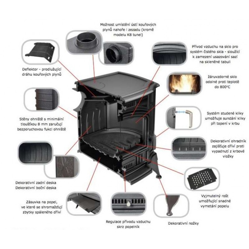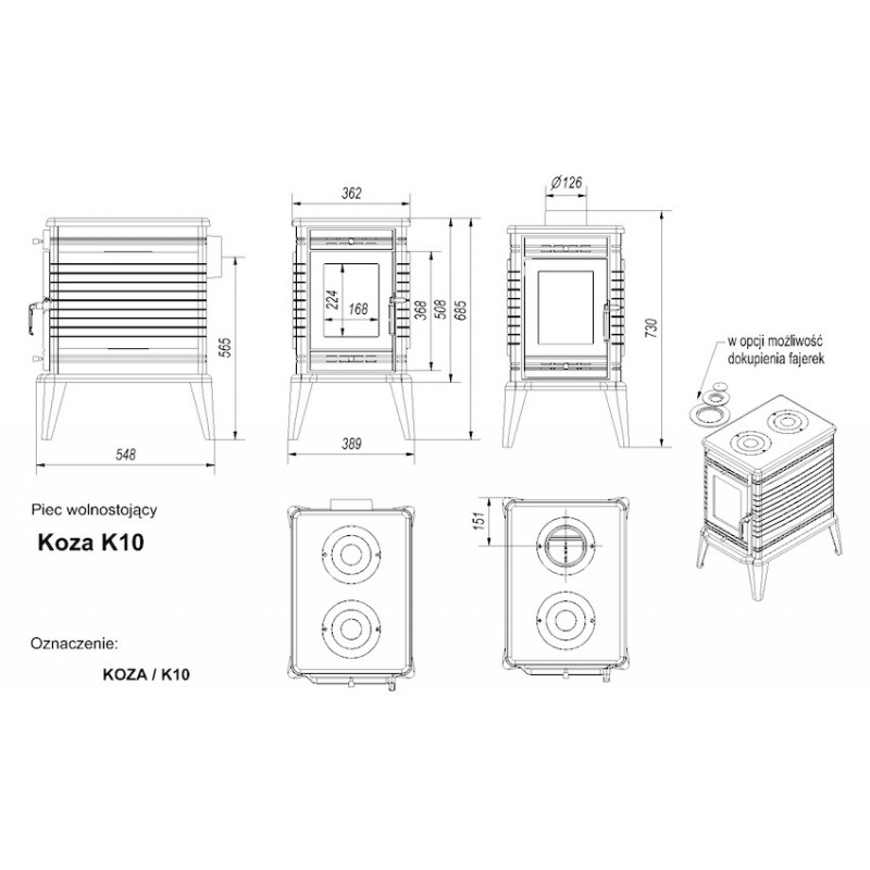 KRATKI Koza K10/130, 10kW krbová kamna teplovzdušnáKamna vyrobená z kvalitní litiny zaujmou klasickým designem, který je zvýrazněný šikmým prosklením po obou stranách dvířek. Tato varianta prostorově zvětší efekt plamene.