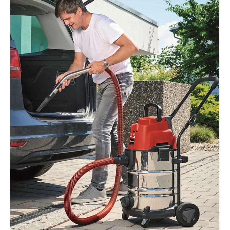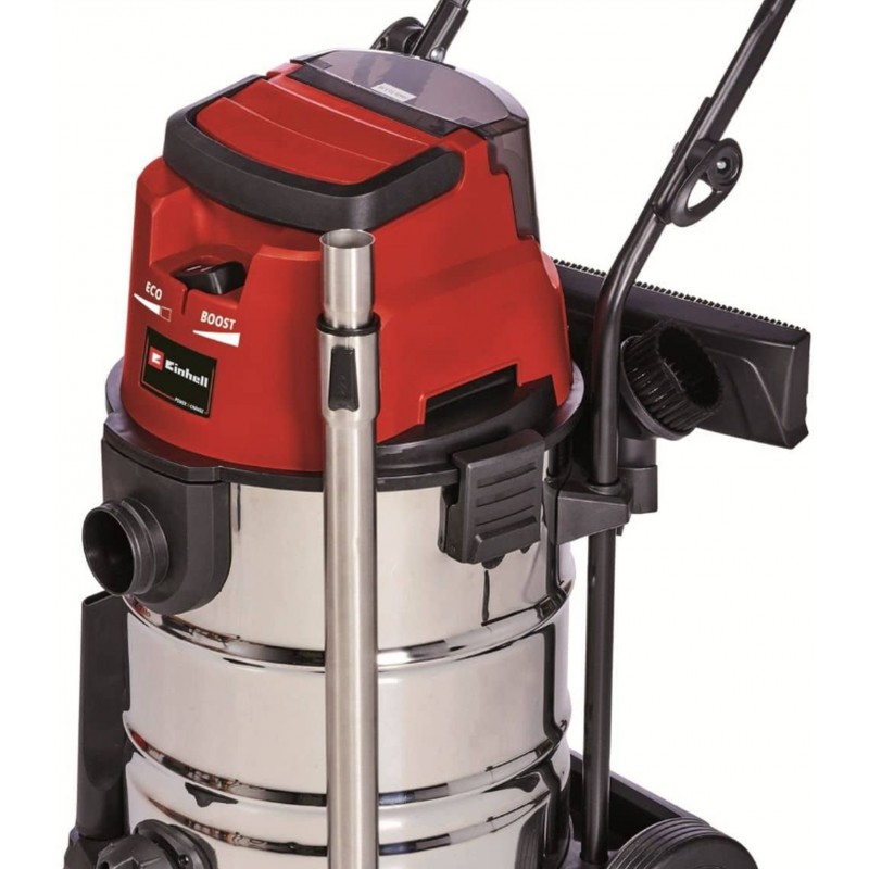Akumulátorový mokro-suchý vysavač Einhell TE-VC 36/30 Li S-Solo je členem rodiny Power X-Change, k provozu jsou zapotřebí baterie 2x18V. Dodávka probíhá bez baterie a nabíječky. Vysavač nabízí vysoký sací výkon s bezdrátovou svobodou a 2 rychlosti (ECO/BOOST) pro optimální využití baterie. Špinavou vodu lze vypustit pomocí vypouštěcího šroubu v nerezové 30l nádobě z nerezové oceli. Vysavač má velká kola a válečky, přípojku foukání, chybějící regulátor vzduchu a držák příslušenství. Součástí dodávky jsou 2 kusy. Sací potrubí z nerezové oceli a 2,50 m plastová sací hadice, velká kombinovaná/štěrbinová/čalounická hubice, pěnový a skládaný filtr a papírový sáček na sběr nečistot.