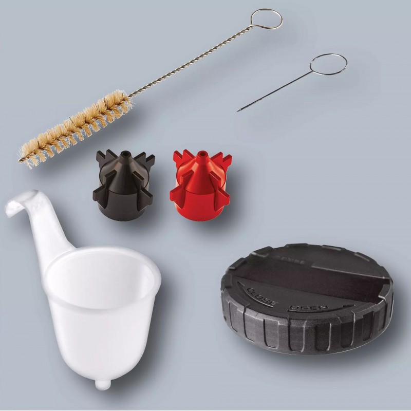 Obsahuje dvě trysky pro různé viskozity laků a lazur, nádobu pro kontrolu viskozity, nádobu na barvu o objemu 1000 ml a víčko pro čisté uzavření.