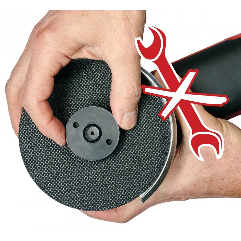 Bez použití speciálního klíče lze řezný kotouč díky systému Quick Fix Nut na akumulátorové úhlové brusce Einhell TE-AG 18/115 Q Li upevnit. Výměna kotouče je tak zcela beznástrojová a blesková, hotová za méně než 10 sekund. Proti nechtěnému stisknutí je vřetenová pojistka zapuštěna. Bruska je určena pro použití s řeznými kotouči o průměru max. 115 mm.