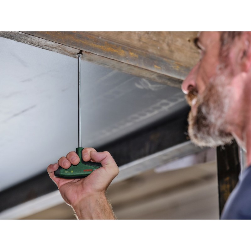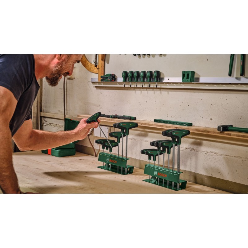 7dílná sada šroubováků Torx Bosch s T-rukojetí přináší větší pohodlí a flexibilitu při řešení domácích kutilských úkolů. Všechny šroubováky Torx s T-rukojetí (TX9, TX10, TX15, TX20, TX25, TX30, TX40) jsou bezkonkurenční pro kontrolované a výkonné šroubování, a to i na těžko přístupných místech, při montáži nábytku nebo údržbě kol, motocyklů a automobilů. Ergonomické dvousložkové rukojeti ve tvaru písmene T s velkými plochami měkkého úchopu jsou navrženy pro pohodlný a efektivní přenos síly při šroubování, a to i při vysokém krouticím momentu. Každý šroubovák s rukojetí tvaru písmene T je vybaven ocelovou hřídelí S2, která je nejlepší ve své třídě (56–60 HRC). Extra dlouhé dříky usnadňují přesnou práci v úzkých, těžko přístupných oblastech. Díky intuitivnímu ukazateli velikosti na rukojeti je snadné vybrat ten správný šroubovák pro každou práci. Dobře organizované šroubováky s rukojetí ve tvaru písmene T se dodávají v kovovém stojanu, který lze postavit nebo namontovat na stěnu.
