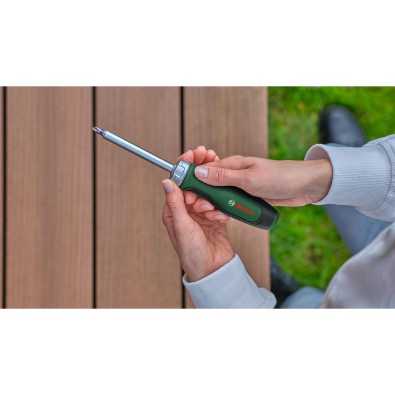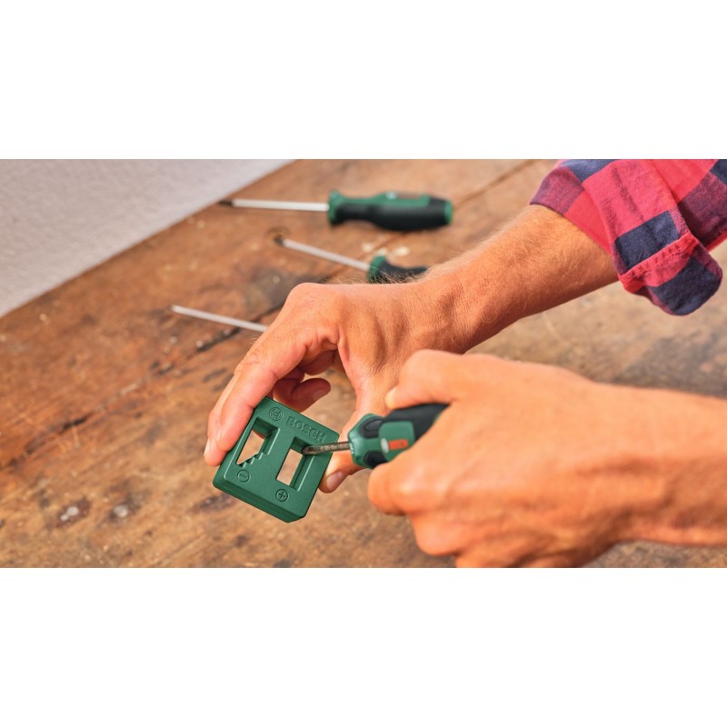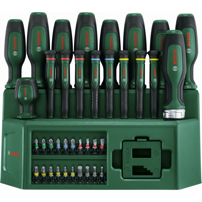 Zmákni každý šroubovací úkol rychle a efektivně s vysoce kvalitní 39dílnou smíšenou sadou šroubováků Bosch. Smíšená sada obsahuje širokou nabídku šroubováků: 8 běžných šroubováků (PH1/2, PZ1/2, SL4/6,5, TX20/25), 8 přesných šroubováků (SL1,5/2,5/3, PH00/PH0, TX5/6/8), ráčnový šroubovák, krátký bitový šroubovák a 20 bitů (PH1/2/3, PZ1/2/3, SL3/4/5/6, TX10/15/20/25/30,40, HEX3/4/5/6). Všechny šroubováky jsou vyrobeny z odolných materiálů. Mají dvousložkové rukojeti s měkkým úchopem pro maximální pohodlí. Díky barevně kódovanému označení typu lze šroubováky a bity vybírat snadněji a rychleji. Sada obsahuje také magnetizér pro snadnou magnetizaci a demagnetizaci hrotů šroubováků a bitů. Dodává se v praktickém stojanu, který lze umístit na pracovní stůl a nabízí přehledné ukládání a snadný přístup.