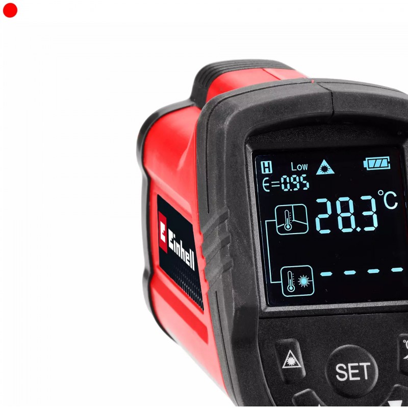 Infračervený teploměr Einhell TC-IT 550 je praktický pomocník do domácnosti i do dílny a umožňuje rychlé a přesné měření teplot běžných objektů. Ať už jde o opravy nebo údržbu, měření teploty trub, pizzakamenů či lednic, nebo odhalování špatné izolace oken a dveří: teploměr umožňuje průběžné měření teplot s laserovým zaměřením v rozsahu –50 °C až +550 °C. Měřicí bod se určí pomocí jasně viditelného laserového bodu. Pracovní vzdálenost je mezi 0,3 a 1,2 m. Před měřením lze zvolit jednu ze tří úrovní emisivity podle povrchu, na kterém chcete měřit. Díky podsvícenému LCD displeji jsou naměřené hodnoty zobrazeny přehledně. Jedním tlačítkem lze přepínat jednotky mezi °C a °F. Pro úsporu energie se infračervený teploměr po 1 minutě nečinnosti automaticky vypne. Pro provoz jsou potřeba dvě AA baterie, které nejsou součástí balení.