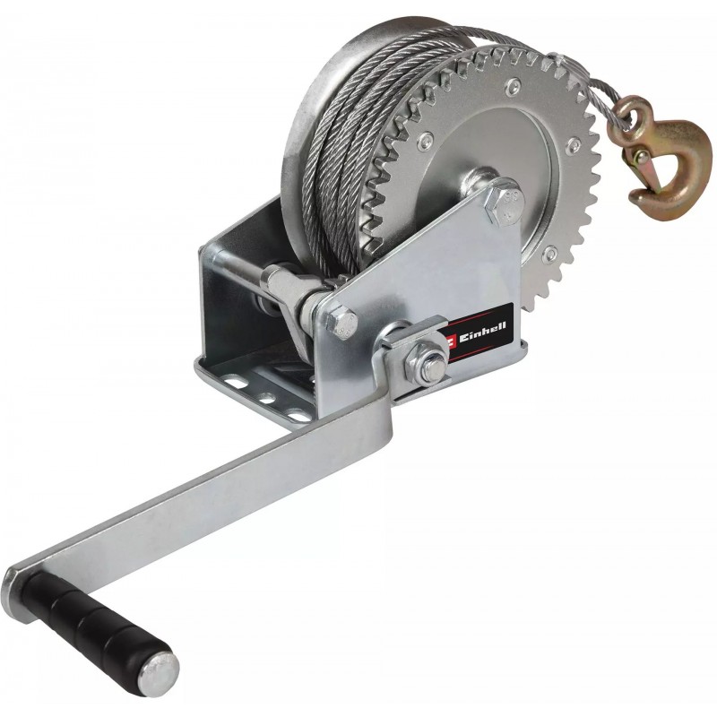 Ruční naviják Einhell TC-WI 800 má maximální nosnost 800 kilogramů. Ruční lanový naviják od Einhellu má 20 metrů dlouhé, nekroucené ocelové lano (O 4,8 mm) s bezpečnostním hákem a bezpečnostní klapkou. Bezpečnostní klapka zabraňuje nechtěnému vyvěšení nákladu. Díky zpětné zarážce lze lano i břemeno bezpečně zastavit. Ruční klika je opatřena měkkou rukojetí pro bezpečné, pevné držení a pohodlnou práci. Uchycení pomocí montážní desky s otvory je rychlé a snadné.