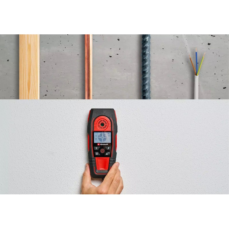 Digitální detektor Einhell TE-MD 80 je nepostradatelným pomocníkem pro každého kutila i profesionála. Před vrtáním do zdi umožňuje přesně ověřit, zda je vybrané místo bezpečné. Digitální detektor signalizuje polohu kovů, dřeva a živých elektrických kabelů uvnitř zdi. Železné kovy, jako je ocel, lze detekovat až do hloubky 80 mm, živé kabely až do 60 mm, neželezné kovy, jako je měď, až do 38 mm a dřevo až do hloubky 24 mm. Výsledek detekce je jasně signalizován akustickým varováním, snadno čitelným LCD displejem a světelným kroužkem. Pokud světelný kroužek kolem středicího otvoru svítí zeleně, nebyla nalezena žádná překážka a místo lze označit přes značicí otvor. Při oranžovém světle se detektor k objektu přibližuje a červená signalizuje, že středicí otvor je přímo nad detekovaným objektem, například kovovým profilem. Režim lze zvolit rychle a intuitivně pomocí integrovaných tlačítek. Manipulace s přístrojem je velmi snadná díky automatické kalibraci. Ochranný jezdec na zadní straně chrání zeď při používání. Kompaktní design se soft grip povrchy a dodaným zápěstním popruhem umožňuje pohodlné ovládání jednou rukou. Pokud je digitální detektor TE-MD 80 odložen, automaticky se po jedné minutě nečinnosti vypne, aby šetřil baterii. Pro provoz je potřeba jedna 9 V baterie (není součástí balení).