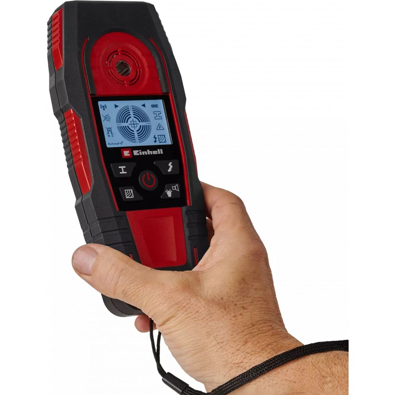 Digitální detektor Einhell TE-MD 80 držený za popruh, na displeji jsou vidět naměřené výsledky.