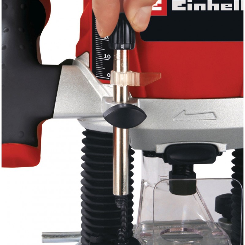 Horní frézka Einhell TE-RO 1255 E zepředu s viditelným nastavením hloubky frézování a paralelním dorazem.