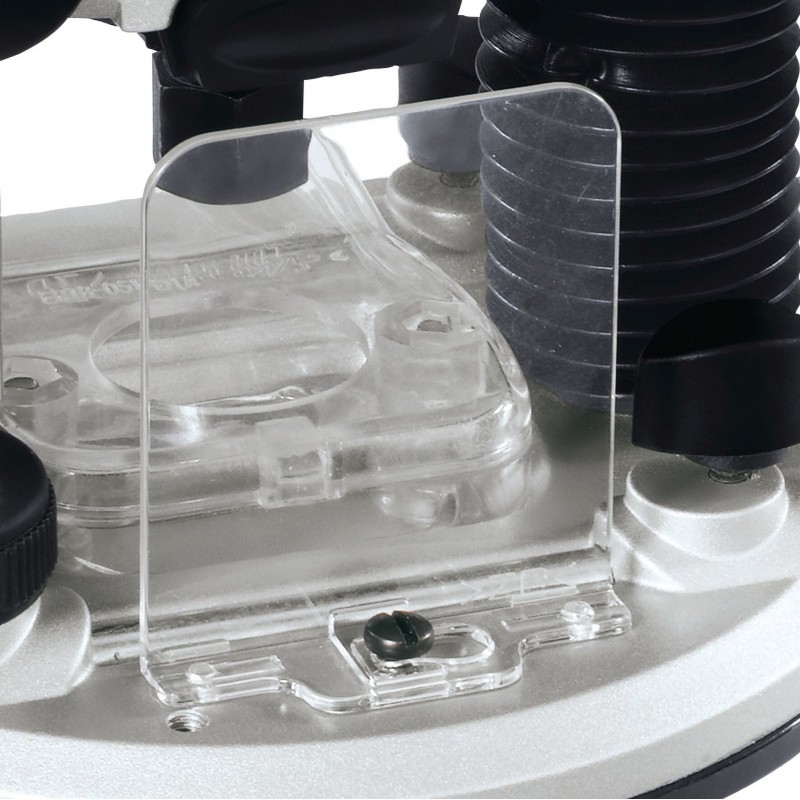 Detailní pohled na průhledný kryt proti třískám horní frézky Einhell TE-RO 1255 E pro ochranu před dřevními třískami.