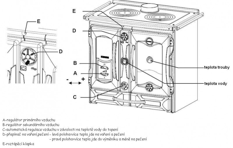 přepínací klapka plotna, trouba – možnost vyřazení trouby (v letních měsících nebo při zatápění)