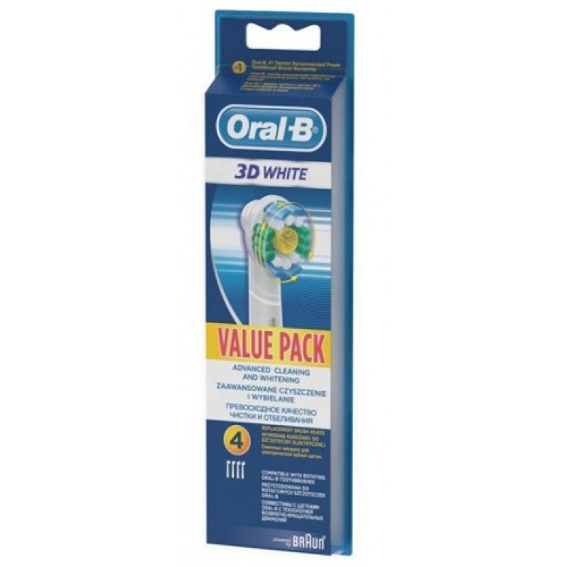 Speciální vlákna Indicator indikují opotřebení. Při odbarvení půlky vláken je zapotřebí hlavici vyměnit za novou. Odborníci na základě dlouhodobých zkušeností doporučují výměnu hlavic přibližně každé tři měsíce v případě běžného užívání kartáčku 2x denně. Dodržování tohoto intervalu zajišťuje stále perfektní péči o zuby. Součástí balení jsou barevné výměnné kroužky, pro snadnou identifikaci kartáčku. Balení obsahuje 4 ks náhradních kartáčků. Kartáček Braun EB 18-4 3D White Luxe je vhodný ke všem zubním kartáčkům Oral-B (kromě CrossAction Power).