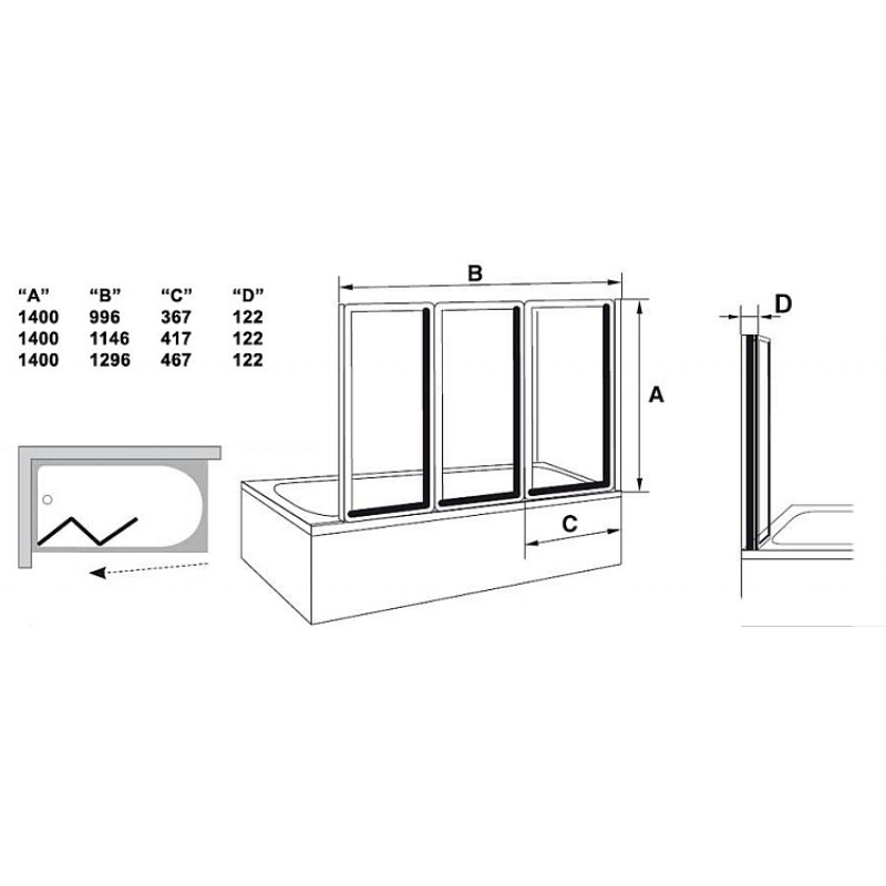 Vanová zástěna třídílná skládací k obdelníkovým vanámv rozměru (š/v): 996 x 1400 mm
